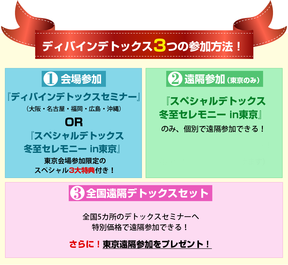 ①会場参加 (会場参加の場合、CDのご注文は受け付けておりません) 東京会場参加はスペシャル3大特典付き! ②遠隔参加(東京のみ) 当日の音声URLをプレゼント!(別途CDもご注文いただけます) ③全国遠隔デトックスセット 全国5カ所のデトックスセミナーへ特別価格で遠隔参加できる!さらに!東京遠隔参加をプレゼント! さらに!すべての会場の音声URLをプレゼント! (別途CDもご注文いただけます) |